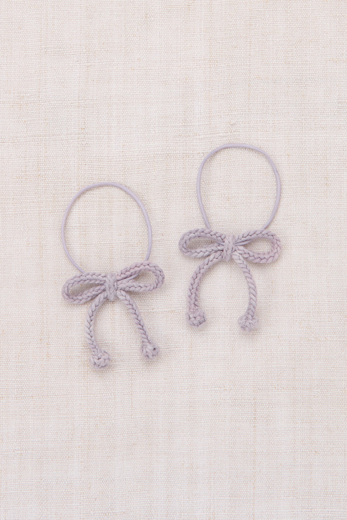 pair of hand-knit bows with popcorn detail in Pima cotton, attached to elastics.