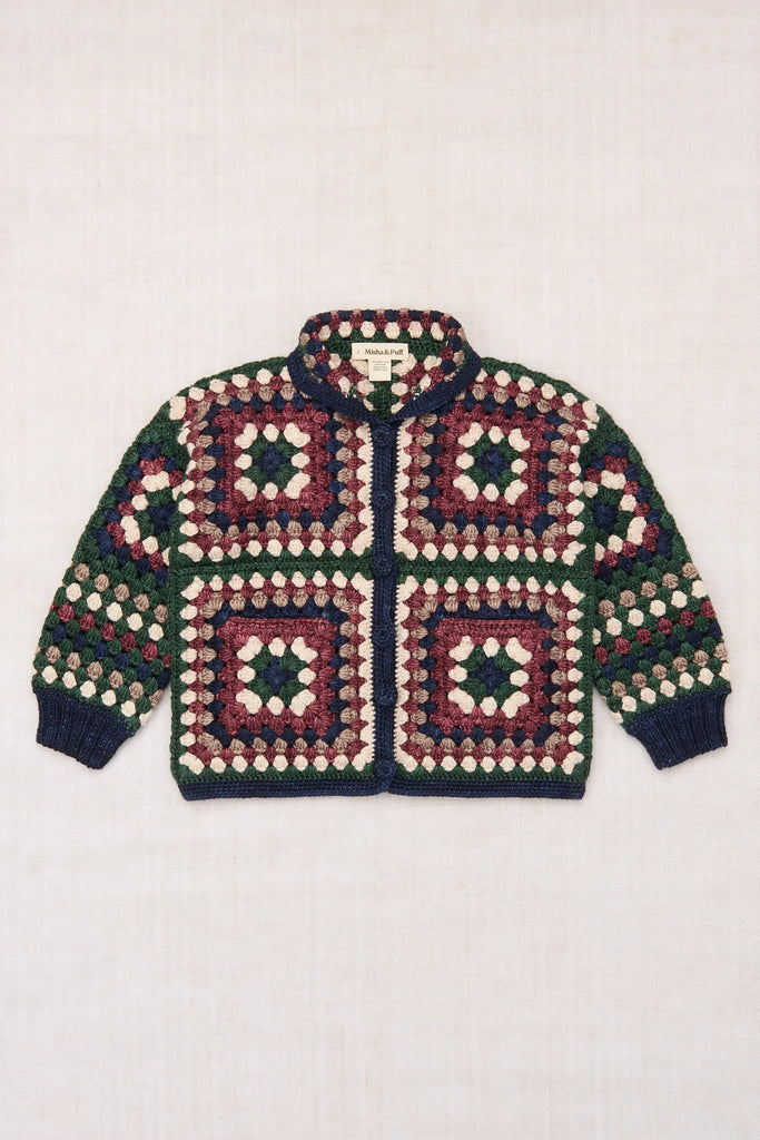 A hand-crocheted jacket sweater in Merino wool, featuring a "granny square" details, a collar, and crochet button closure. A standout style that is both collectible and an easy heirloom piece.