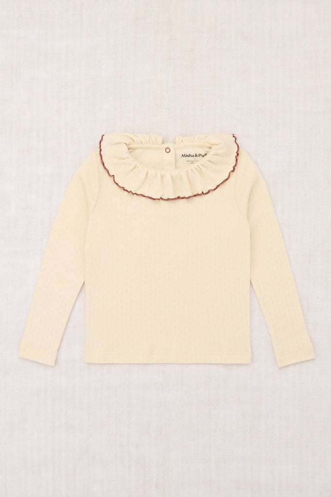 A long-sleeved slim-fit top in soft organic Pima cotton, featuring a delicate pointelle pattern, a gathered ruffle neck with contrast merrowed edge and snap closure at the back neck.