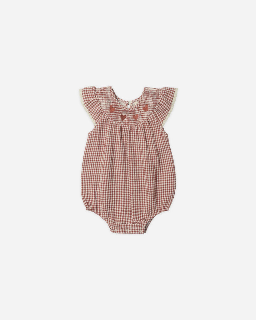 The Lenore Romper features ruffle sleeves with crochet lace trim, smocked neckline with red embroidered hearts, button at back neck, elastic leg openings and bottom snap closures for easy changes and a perfect fit. Style with matching Little Knot Headband.