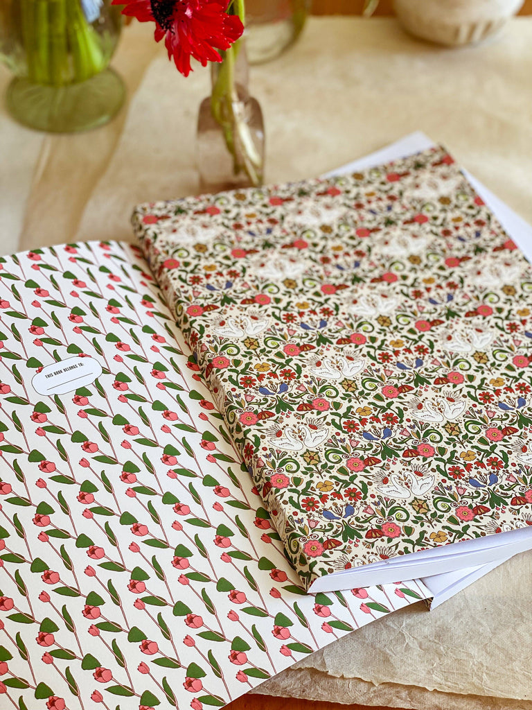 The Cambrifornia notebook highlights our customer-favorite Cambrifornia pattern pairings with the hero multicolored pattern inspired by the birds and flowers of Cambridge, England and California on the cover and a sweet coordinating pink green and cream tulip pattern on the inside cover with a plaque area to write the owner's name. The dot grid pages make it versatile for journaling, notes and sketches. A great year round option for notebook lovers, Mother's Day gift or birthday present, this notebook is a great addition to any stationery or gift shop year round. Consider displaying with our Cambrifornia greeting cards, gift wrap, gift bags and gift tags for a easy gift giving.
