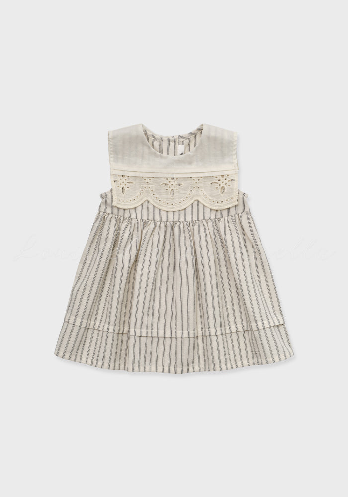 Louisiella’s baby girl’s dress with a classic nautical charm with its vintage-inspired striped pattern and sailor-style scalloped lace collar, delicately embroidered for a refined touch. This lightweight, breathable dress is perfect for seaside adventures and summer holidays. Pair it with a cozy cardigan for a polished look on breezy evenings.