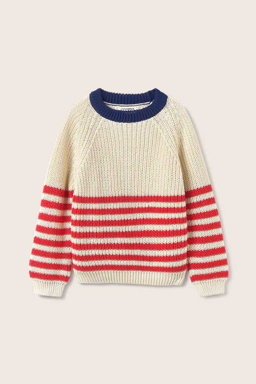 Sweater made of soft cotton tricot with pearled stitch texture. Contrasting color at the neck and the stripes on the arms and the bodice. Raglan sleeves. Rib at neck, cuffs, and hem.