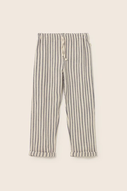 Striped pants in a rustic yet soft cotton fabric. Elastic waistband with a decorative drawstring. Rolled-up hems.