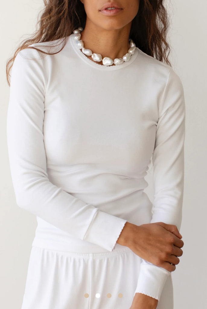 The Baby Rib Scallop Long Sleeve is crafted from our dreamiest, butter-soft fabric—it's like a hug from a stick of butter (you truly have to feel it to believe it). Designed with a classic crewneck, slim-fit, and finished with scalloped edges along the neckline and cuffs.