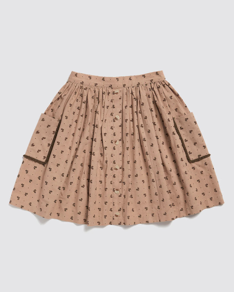 A lovely, full skirt made in our organic rosehip floral fabric, perfect for everyday or dressing up for parties. This skirt has patch pockets with contrasting trim and an elasticated waist at the back. Looks great paired with our blouses or organic, jersey, pointelle t-shirts.