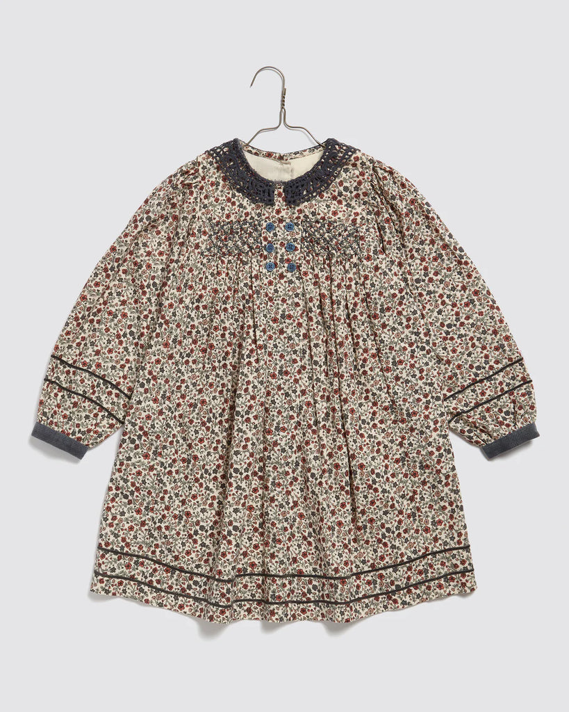 This beautiful vintage-inspired dress, is made in our organic cottage print floral fabric. It has long, full sleeves finished with neat little velvet cuffs, a cotton lace sailor collar and two rows of velvet ribbon to the sleeves and hem. The front button placket has a double row of buttons, either side of which are beautiful, hand-smocked panels