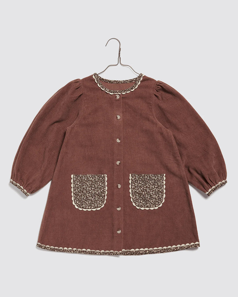 Add a touch of timeless charm to your little ones wardrobe with this beautifully made A-line dress. Made in our organic cotton velvet in nutmeg, with contrasting floral binding trims. This shorter length dress offers both style and comfort, making it perfect for everyday wear or special occasions. This dress is easy to mix and match with our cardigans, jumpers, tank tops, tights and socks. The organic cotton fabric is gentle on delicate skin and durable enough to withstand the hustle and bustle of playtime.