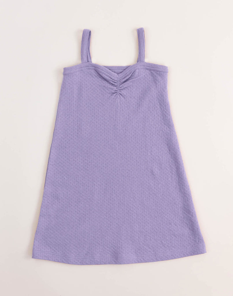 'cuz your mini needs an organic sleep dress too. The kids pointelle sleep dress is made with the softest organic Pima cotton with diamond floral details. Featuring spaghetti straps and a cinched pleat in the middle and falls right above the knee.