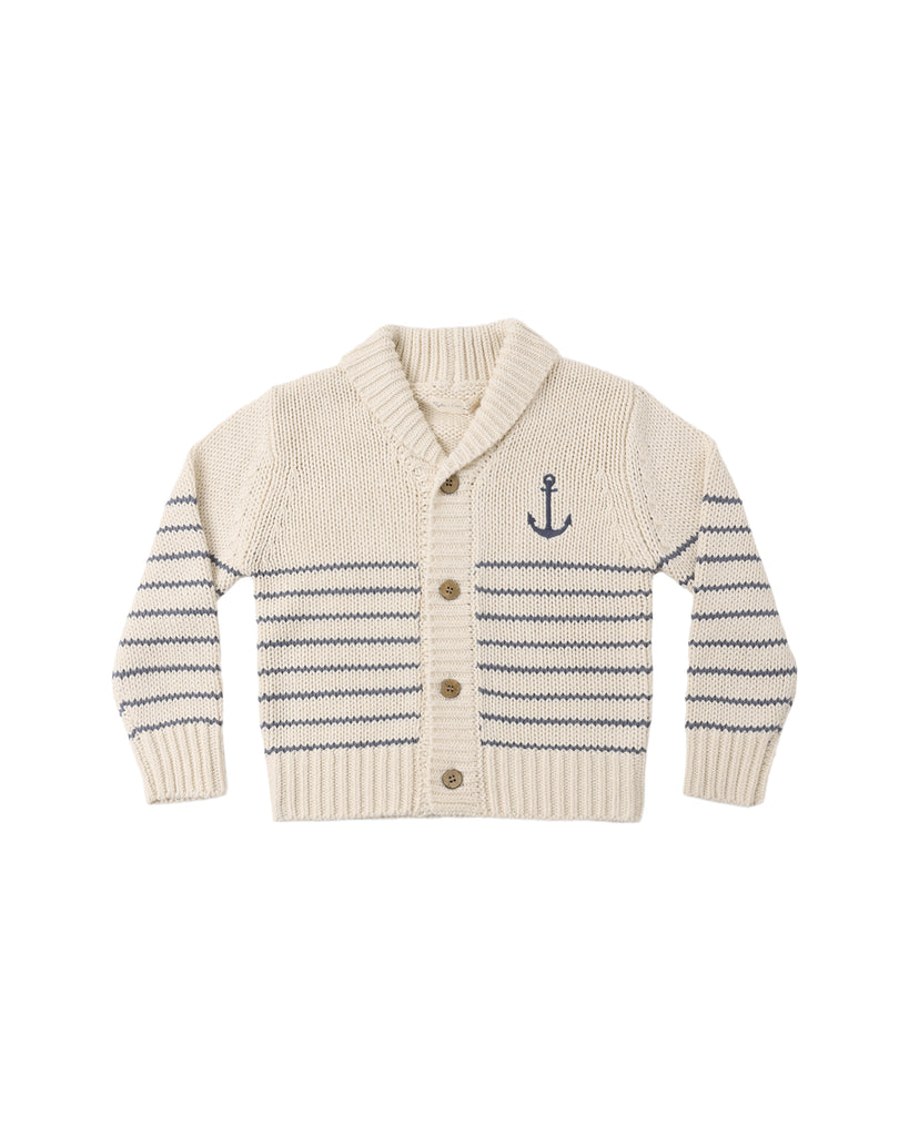 Our Shawl Cardigan is the perfect layer to any outfit! This striped knit is designed with a shawl collar, embroided anchor, rib knit cuff and hem and tortoise shell front buttons.