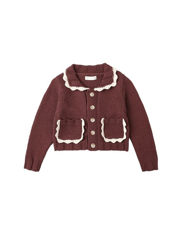 Our Collared Cardigan features contrast crochet scallop detail on the pockets and collar for added charm and class.