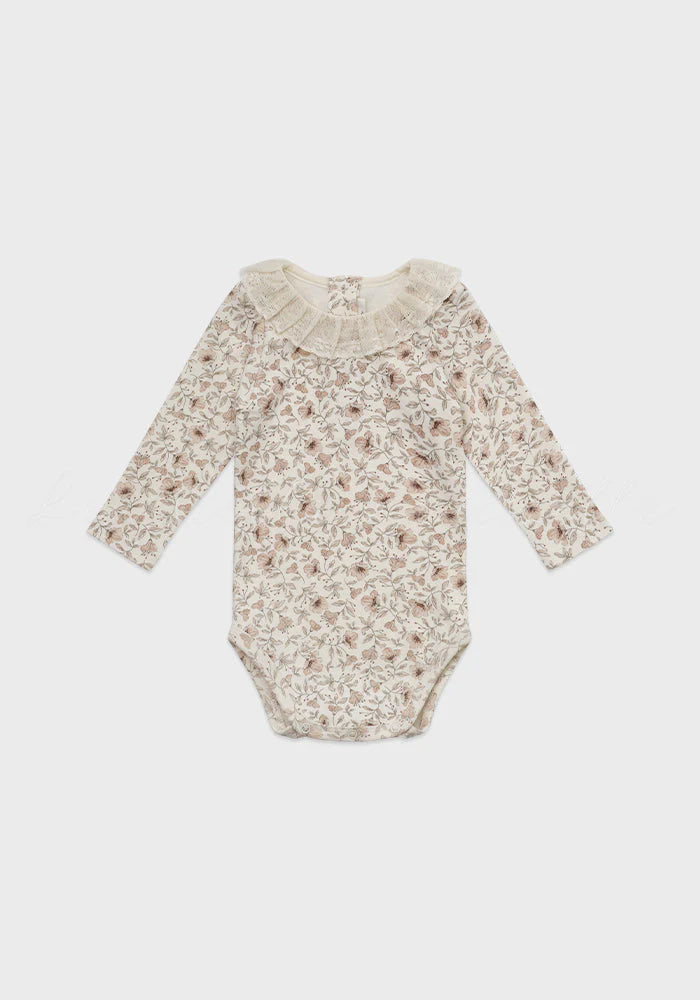 Louisiella's classic baby bodysuit, now elevated with new seasonal print in our signature soft and strecthy cotton modal fabric blend. With its long sleeves and lace collar, it is a staple of any baby girl's wardrobe.