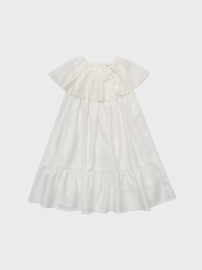 Unique girl's dress with its oversize round collar, creating a cape-like look. Made from a subtly shiny white fabric, making it a perfect dress for all the ceremoies your little one will be participating this summer. Fully lined, wear it comfortably all day.