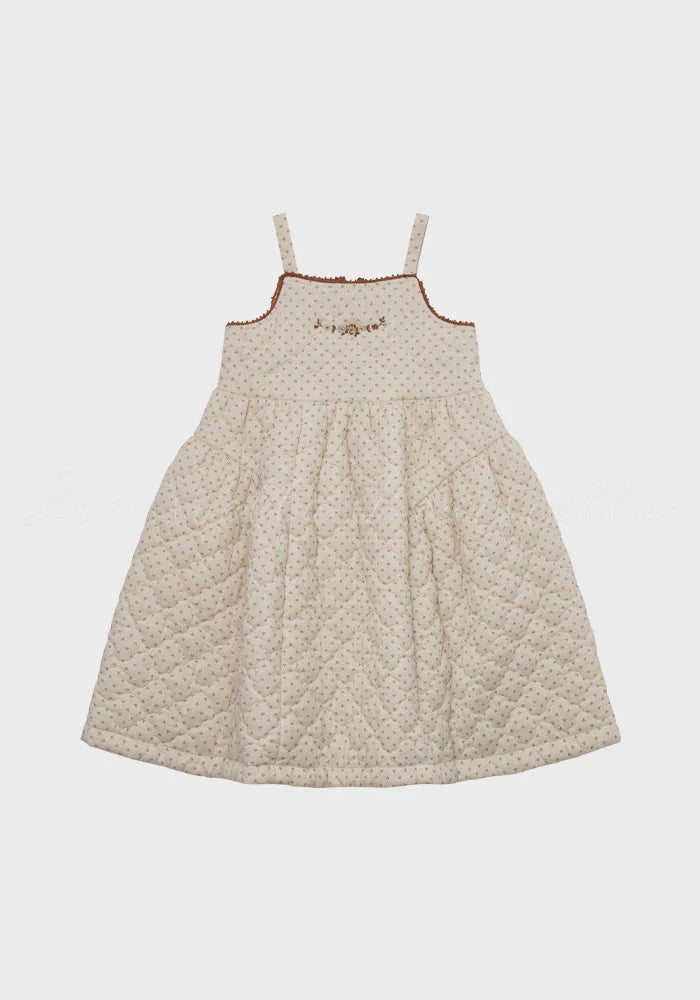 Introducing the latest iteration of Louisiella's iconic quilted creation — a vintage-inspired dainty floral print dress. With its gracefully voluminous fit and delicate beige color, this floral dress effortlessly provides a distinctive silhouette to your young lady. Sleeveless, this padded dress invites being layered over a turtleneck, such as our Tyrenne T-shirt, for a season adequate outfit.