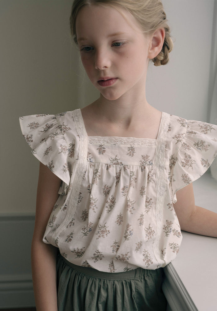 Louisiella’s floral girl’s blouse beautifully blends the brand’s signature flower print with delicate lace accents. Designed with frilled sleeves and a gentle A-line silhouette, this piece brings a soft, romantic mood, perfect for springtime outings and special occasions alike.