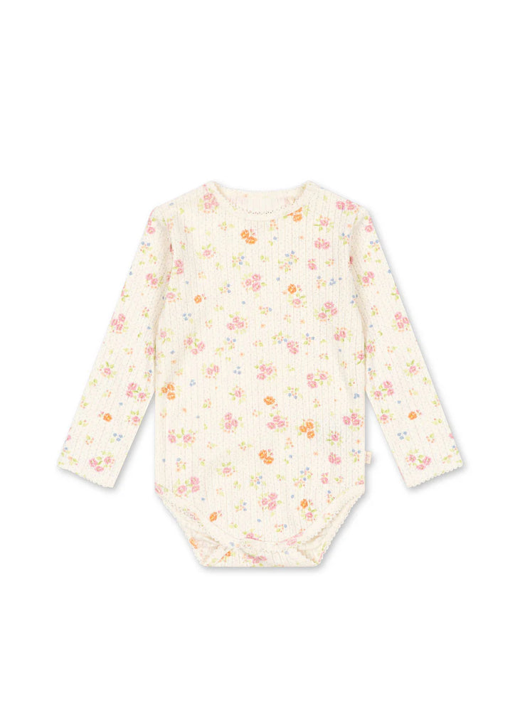 Soft organic cotton body with decorative pointelle. Designed with snap buttons at leg opening for easy dressing.