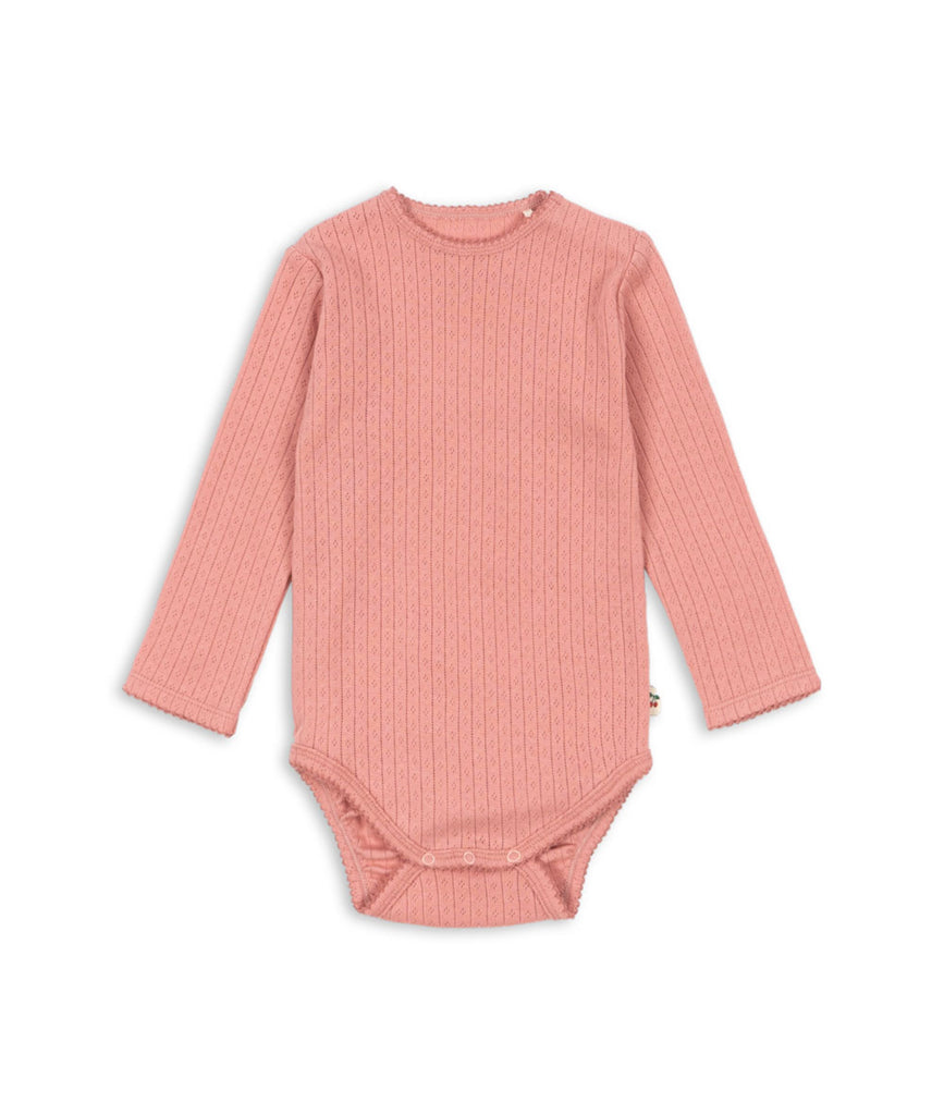 Soft organic cotton body with decorative pointelle. Designed with snap buttons at leg opening for easy dressing.