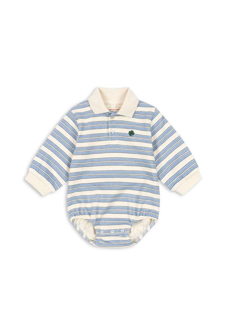 Soft organic cotton romper in a classic polo design. Features a regular collar, button placket, and push button closure at leg openings for easy dressing.
