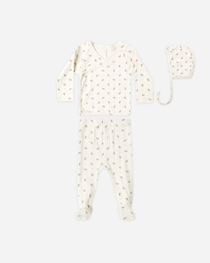 Our Take Home Set is the perfect look for your newborn. Featuring a sweet bonnet, wrap snap top with crochet lace ruffle detail, and footed drawstring pants.